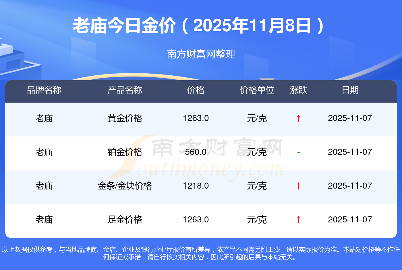 老廟金價(jià)今日價(jià)格:銀條價(jià)格11.4元/克,黃金價(jià)格1263.0元/克,鉑金價(jià)格560.0元/克,金條價(jià)格(內(nèi)地)1202.0元/克,金飾價(jià)格(內(nèi)地)1268.0元/克,黃金飾品(香港)44260.0,鉑金飾品(香港)13080.0,金條金價(jià)(香港)39960.0,投資金條1243.0元/克,工藝金條1258.0元/克,千足金首飾1248.0元/克。