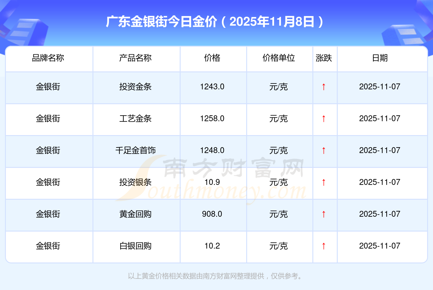 2025年11月8日廣東金銀街金價(jià)查詢:銀條價(jià)格11.4元/克,黃金價(jià)格1263.0元/克,鉑金價(jià)格560.0元/克,金條價(jià)格(內(nèi)地)1202.0元/克,金飾價(jià)格(內(nèi)地)1268.0元/克,黃金飾品(香港)44260.0,鉑金飾品(香港)13080.0,金條金價(jià)(香港)39960.0,投資金條1243.0元/克,工藝金條1258.0元/克,千足金首飾1248.0元/克。