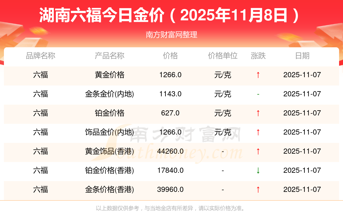 2025年11月8日湖南六,F(xiàn)在黃金一克要多少錢:銀條價格11.4元/克,黃金價格1263.0元/克,鉑金價格560.0元/克,金條價格(內(nèi)地)1202.0元/克,金飾價格(內(nèi)地)1268.0元/克,黃金飾品(香港)44260.0,鉑金飾品(香港)13080.0,金條金價(香港)39960.0,投資金條1243.0元/克,工藝金條1258.0元/克,千足金首飾1248.0元/克。