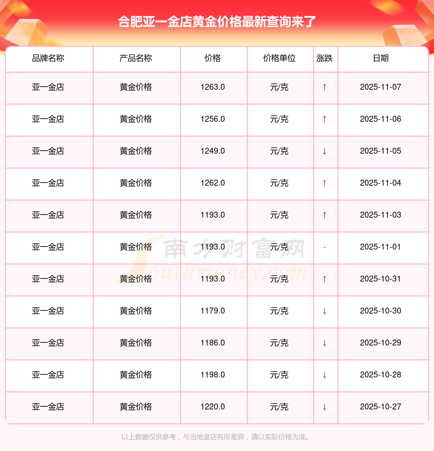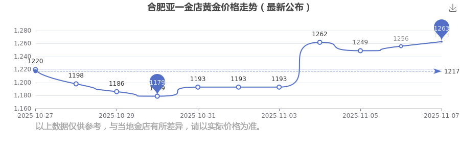 今日(2025年11月8日)合肥亞一金店黃金價格最新價格為1263.0元/克。