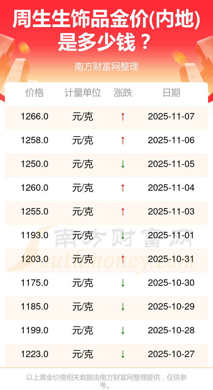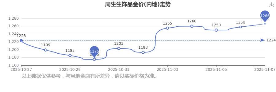 今日周生生 飾品金價(內(nèi)地)最新的市場標價為1266.0元/克。