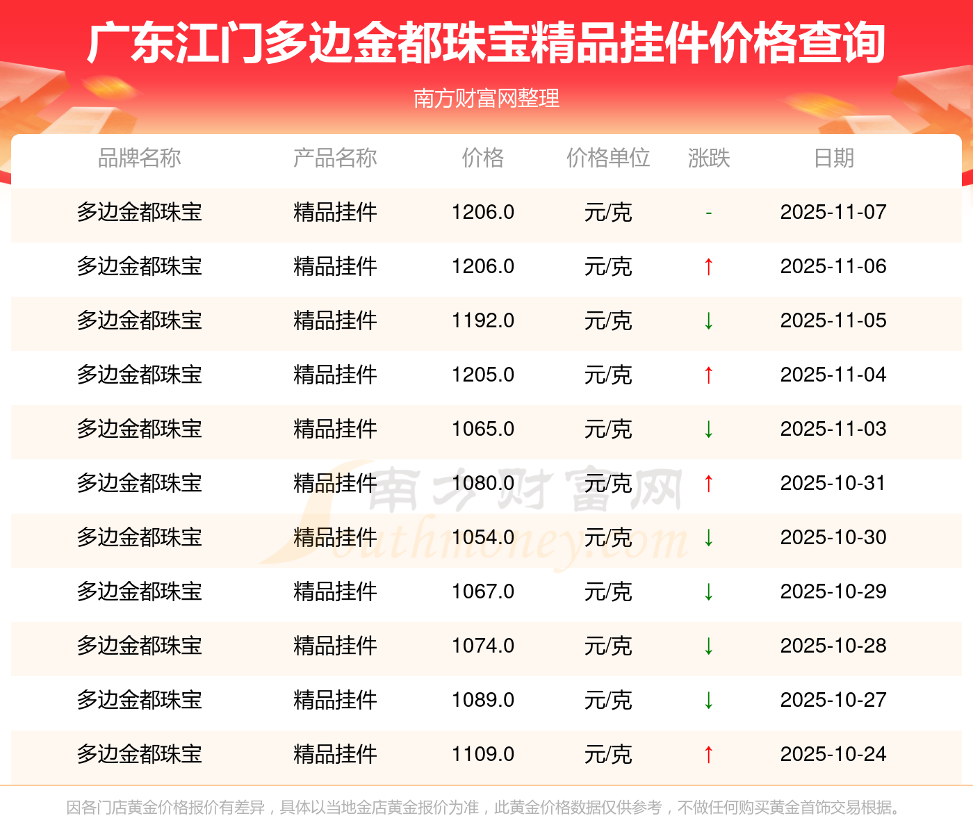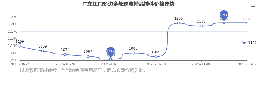 2025年11月8日當天,廣東江門多邊金都珠寶精品掛件的單價是 1206.0元/克。