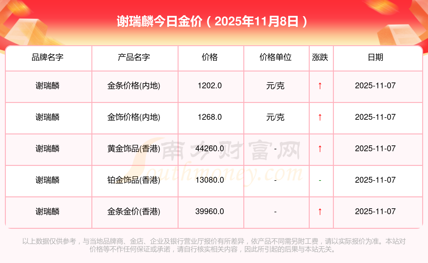 謝瑞麟金價今日價格:銀條價格11.4元/克,黃金價格1263.0元/克,鉑金價格560.0元/克,金條價格(內(nèi)地)1202.0元/克,金飾價格(內(nèi)地)1268.0元/克,黃金飾品(香港)44260.0,鉑金飾品(香港)13080.0,金條金價(香港)39960.0,投資金條1243.0元/克,工藝金條1258.0元/克,千足金首飾1248.0元/克。