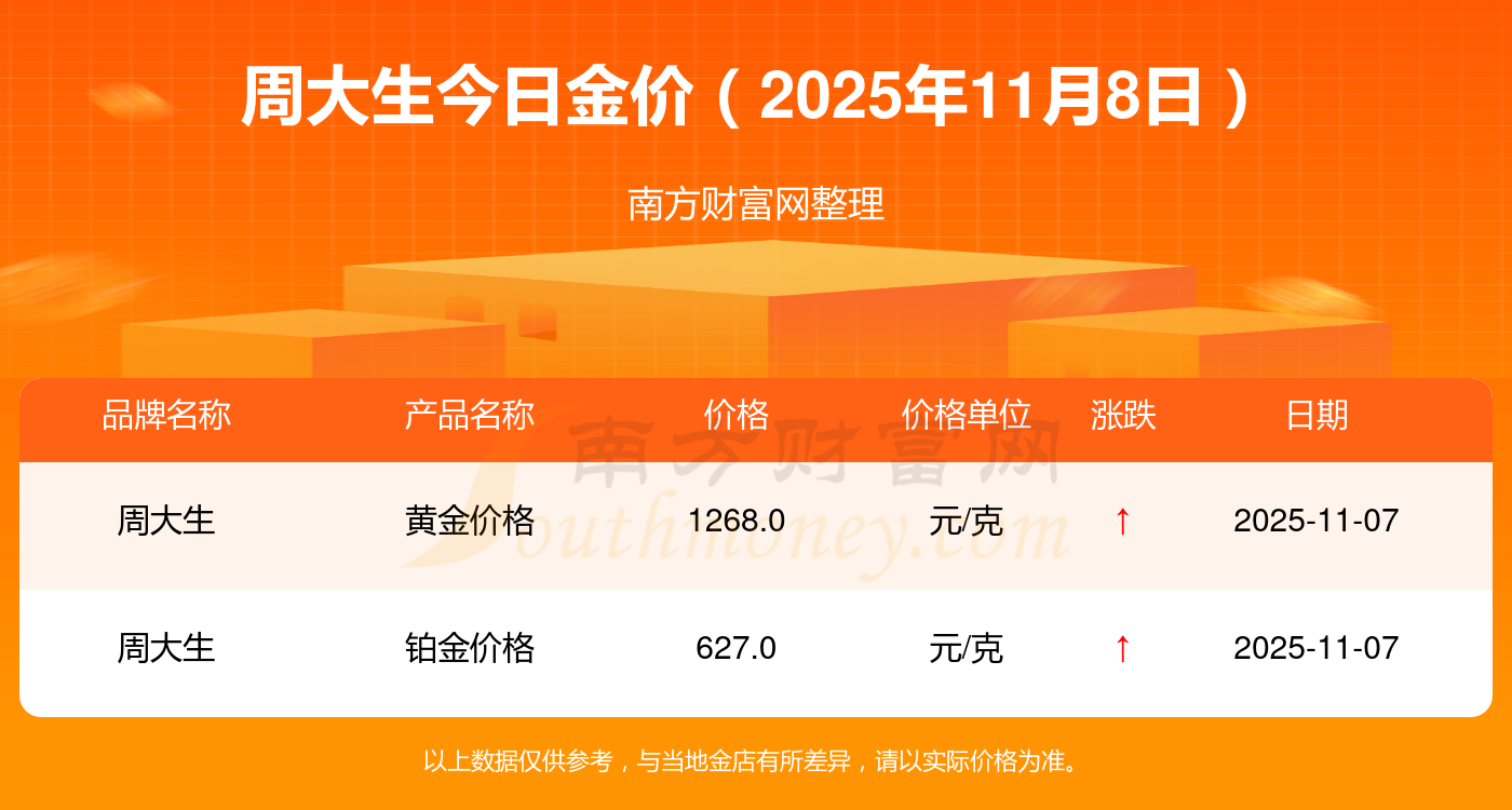 周大生黃金在今日的定價為多少?銀條價格11.4元/克,黃金價格1263.0元/克,鉑金價格560.0元/克,金條價格(內地)1202.0元/克,金飾價格(內地)1268.0元/克,黃金飾品(香港)44260.0,鉑金飾品(香港)13080.0,金條金價(香港)39960.0,投資金條1243.0元/克,工藝金條1258.0元/克,千足金首飾1248.0元/克。