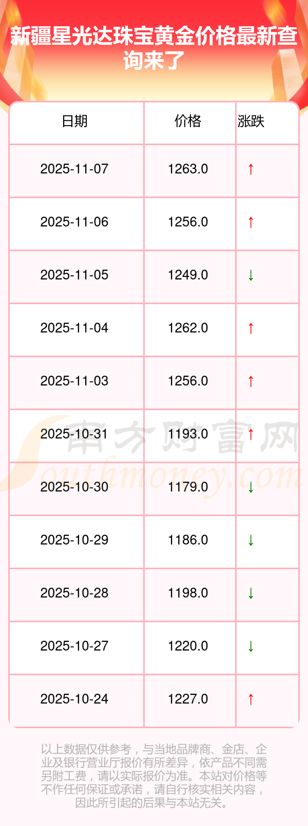 新疆星光達(dá)珠寶黃金價(jià)格在 2025年11月8日為 1263.0元/克。