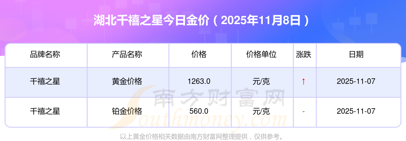今天黃金價格行情如何?現(xiàn)在一克黃金的售價是多少?2025年11月8日湖北千禧之星今日價格:銀條價格11.4元/克,黃金價格1263.0元/克,鉑金價格560.0元/克,金條價格(內(nèi)地)1202.0元/克,金飾價格(內(nèi)地)1268.0元/克,黃金飾品(香港)44260.0,鉑金飾品(香港)13080.0,金條金價(香港)39960.0,投資金條1243.0元/克,工藝金條1258.0元/克,千足金首飾1248.0元/克。