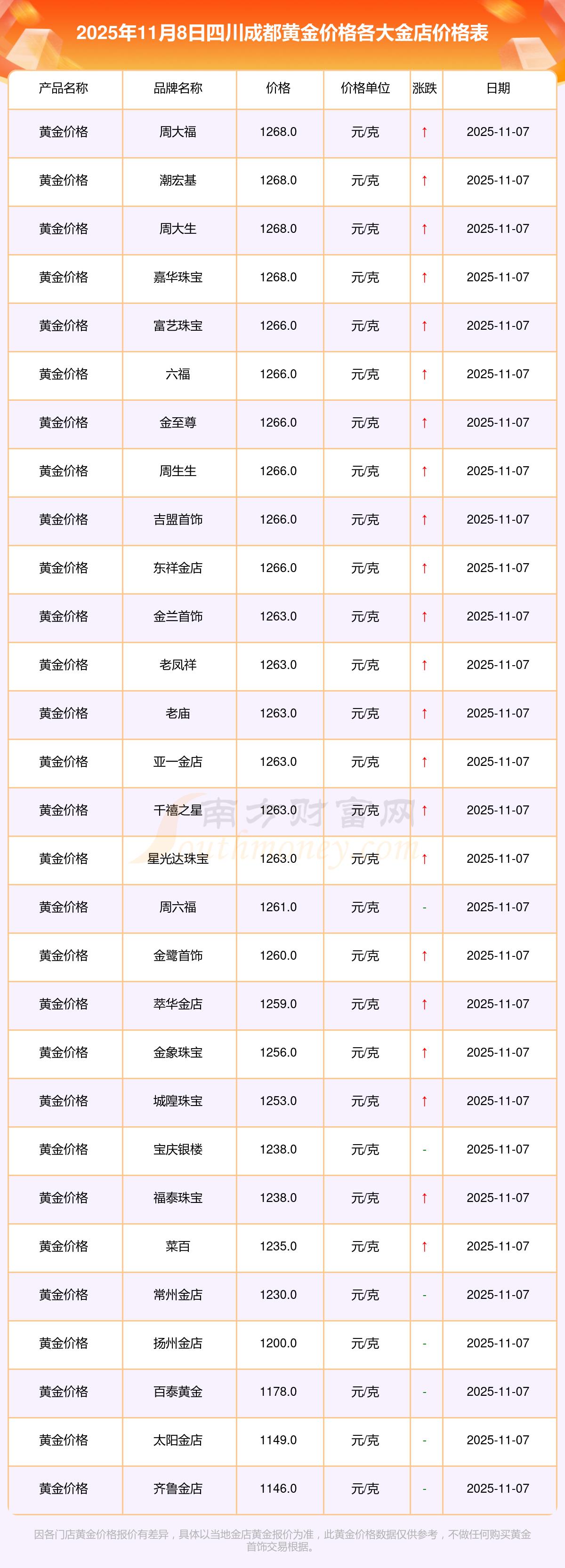 2025年11月8日,四川成都寶泉錢幣、金蘭首飾、金蘭首飾、謝瑞麟、謝瑞麟、謝瑞麟、謝瑞麟、謝瑞麟、金銀街、金銀街、金銀街等各大金店品牌黃金價格今日價格如下:寶泉錢幣11.4元/克、金蘭首飾1263.0元/克、金蘭首飾560.0元/克、謝瑞麟1202.0元/克、謝瑞麟1268.0元/克、謝瑞麟44260.0、謝瑞麟13080.0、謝瑞麟39960.0、金銀街1243.0元/克、金銀街1258.0元/克、金銀街1248.0元/克。