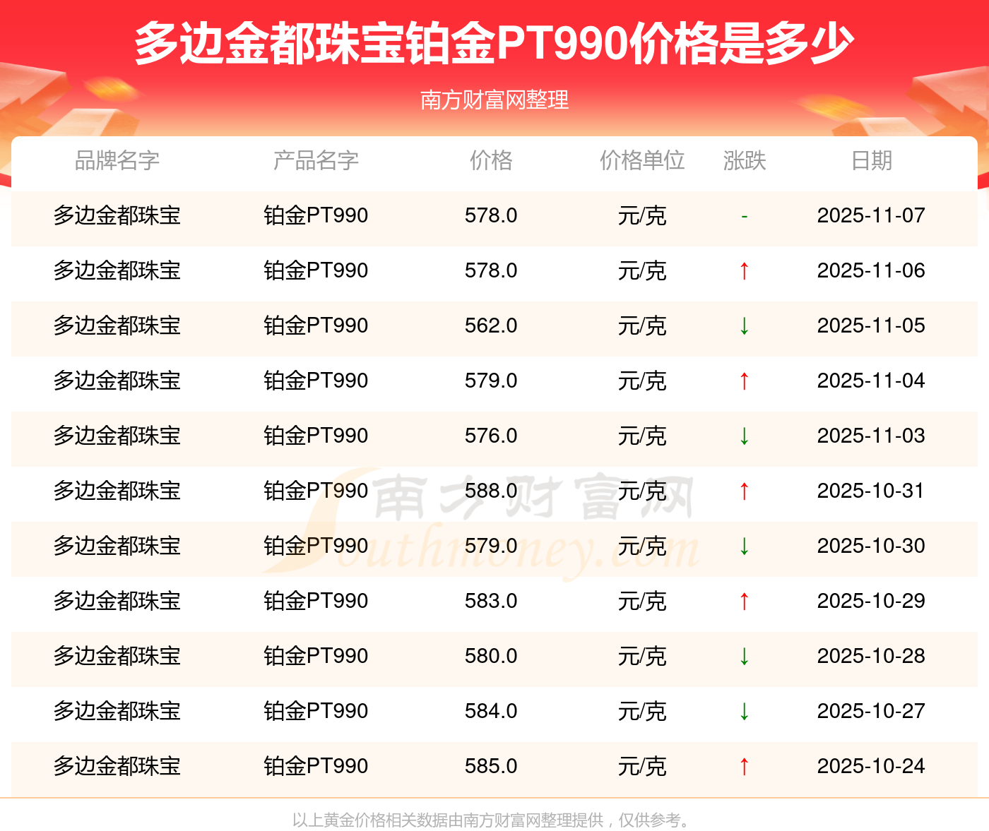 今日多邊金都珠寶所公布的 鉑金PT990最新價(jià)格為578.0元/克。