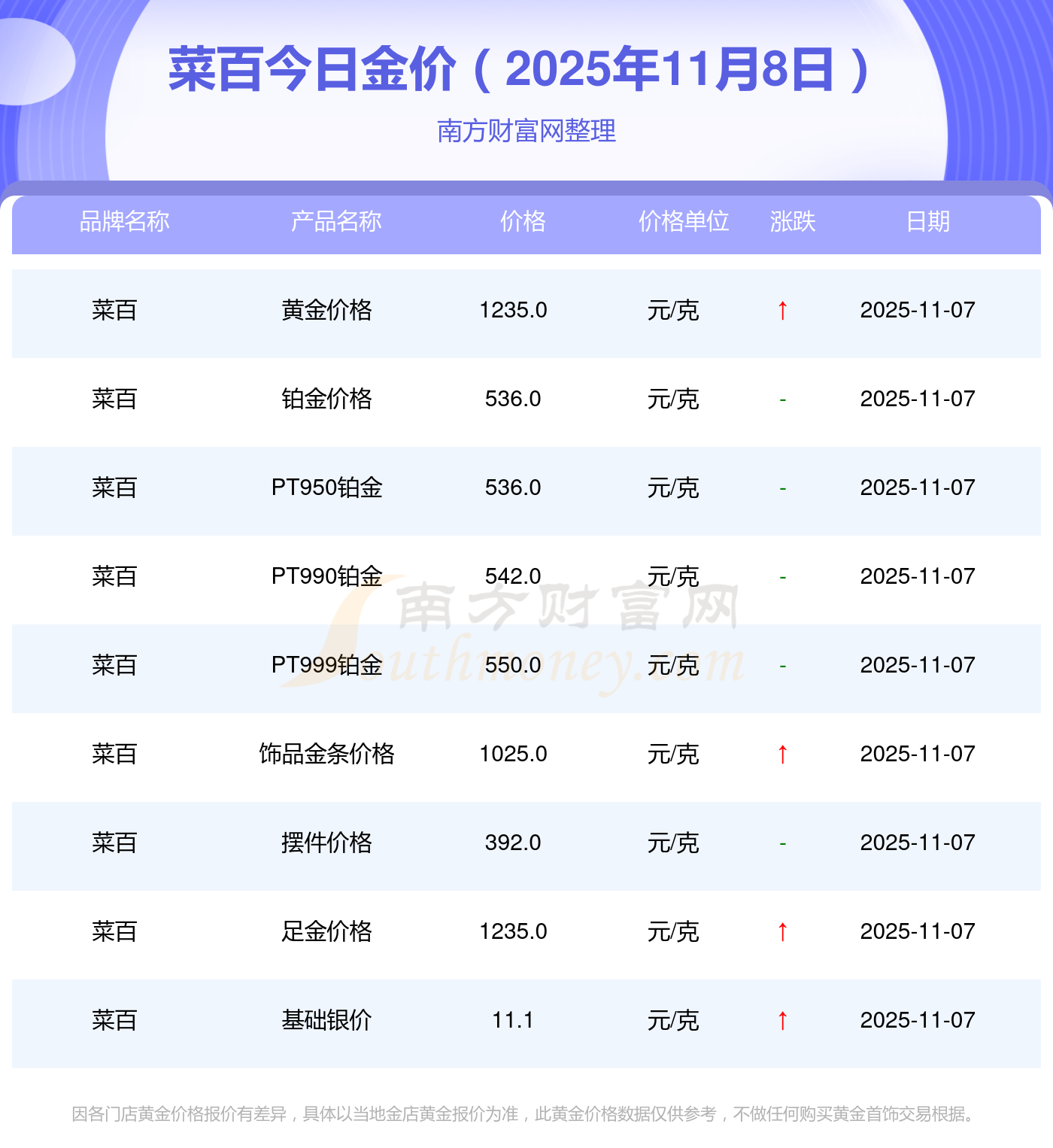 銀條價(jià)格11.4元/克,黃金價(jià)格1263.0元/克,鉑金價(jià)格560.0元/克,金條價(jià)格(內(nèi)地)1202.0元/克,金飾價(jià)格(內(nèi)地)1268.0元/克,黃金飾品(香港)44260.0,鉑金飾品(香港)13080.0,金條金價(jià)(香港)39960.0,投資金條1243.0元/克,工藝金條1258.0元/克,千足金首飾1248.0元/克。