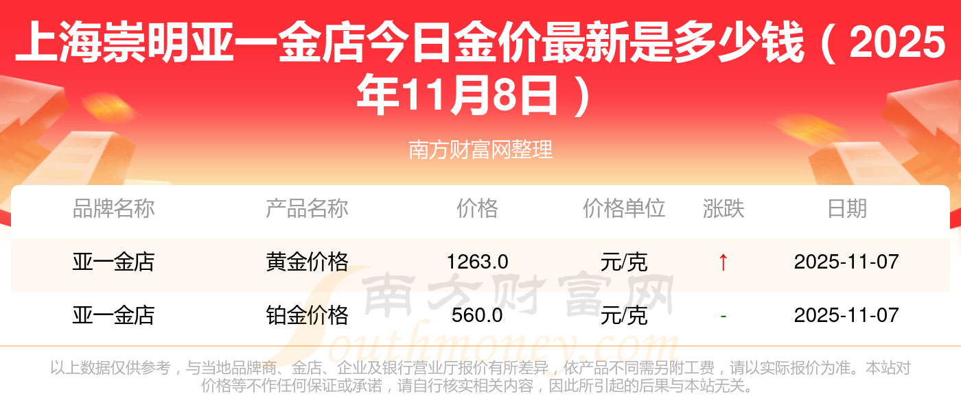 2025年11月8日上海崇明亞一金店黃金的單價,一克為多少?銀條價格11.4元/克,黃金價格1263.0元/克,鉑金價格560.0元/克,金條價格(內(nèi)地)1202.0元/克,金飾價格(內(nèi)地)1268.0元/克,黃金飾品(香港)44260.0,鉑金飾品(香港)13080.0,金條金價(香港)39960.0,投資金條1243.0元/克,工藝金條1258.0元/克,千足金首飾1248.0元/克。