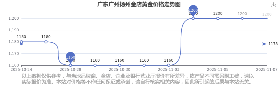 廣東廣州揚(yáng)州金店現(xiàn)在黃金價(jià)格每克多少?現(xiàn)在買一克黃金得花多少錢?今日廣東廣州揚(yáng)州金店黃金價(jià)格查詢,2025年11月8日,廣東廣州揚(yáng)州金店的黃金價(jià)格標(biāo)價(jià)達(dá)到 1200.0元/克。