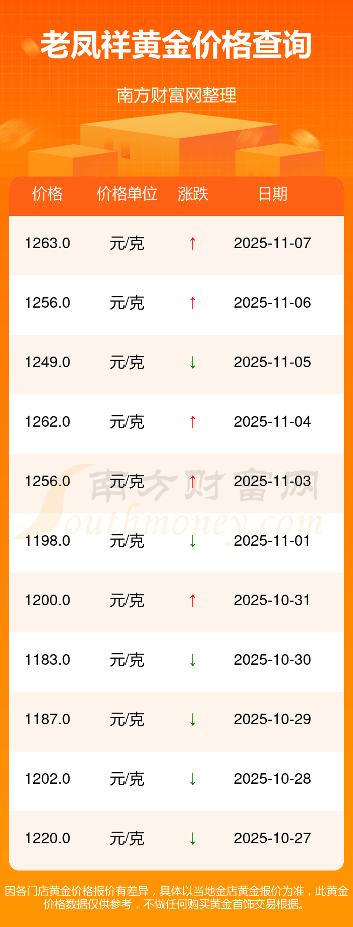 今日老鳳祥 黃金價(jià)格,最新確定為1263.0元/克。