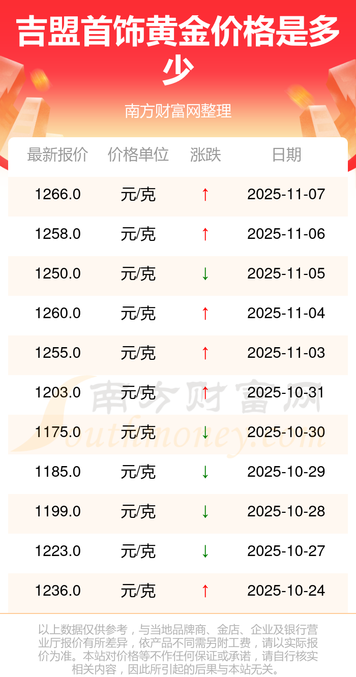 想查詢(xún)當(dāng)下黃金價(jià)格,今日黃金一克的價(jià)格是多少呢?一般而言,黃金每克的售價(jià)是多少呢?今日(2025年11月8日)吉盟首飾黃金價(jià)格:1266.0元/克。