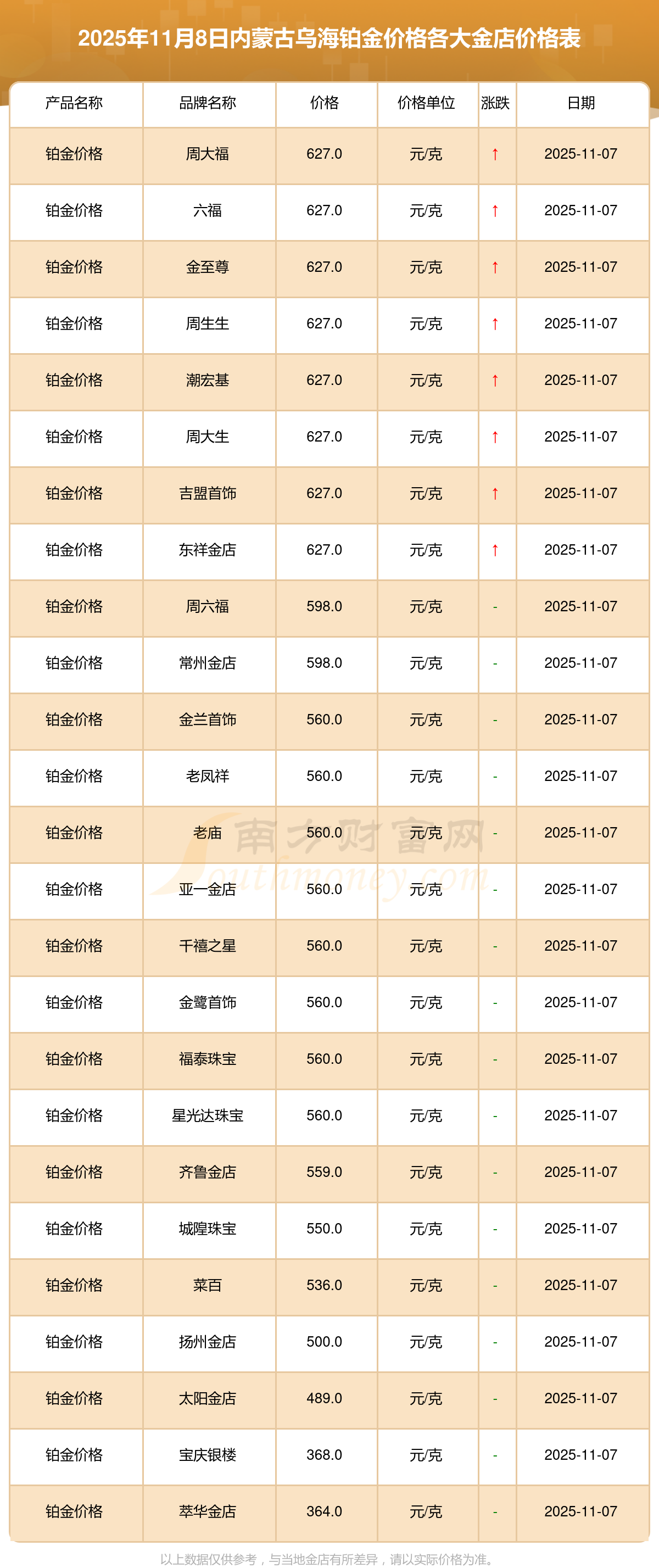 2025年11月8日內(nèi)蒙古烏海各大金店鉑金價(jià)格最新價(jià)格:寶泉錢(qián)幣11.4元/克,金蘭首飾1263.0元/克,金蘭首飾560.0元/克,謝瑞麟1202.0元/克,謝瑞麟1268.0元/克,謝瑞麟44260.0,謝瑞麟13080.0,謝瑞麟39960.0,金銀街1243.0元/克,金銀街1258.0元/克,金銀街1248.0元/克。