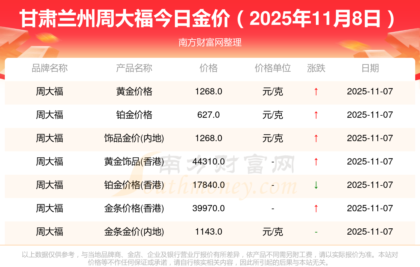 今日黃金價(jià)格是怎樣的?當(dāng)下黃金一克要賣多少錢?2025年11月8日甘肅蘭州周大,F(xiàn)在黃金一克要多少錢:銀條價(jià)格11.4元/克,黃金價(jià)格1263.0元/克,鉑金價(jià)格560.0元/克,金條價(jià)格(內(nèi)地)1202.0元/克,金飾價(jià)格(內(nèi)地)1268.0元/克,黃金飾品(香港)44260.0,鉑金飾品(香港)13080.0,金條金價(jià)(香港)39960.0,投資金條1243.0元/克,工藝金條1258.0元/克,千足金首飾1248.0元/克。