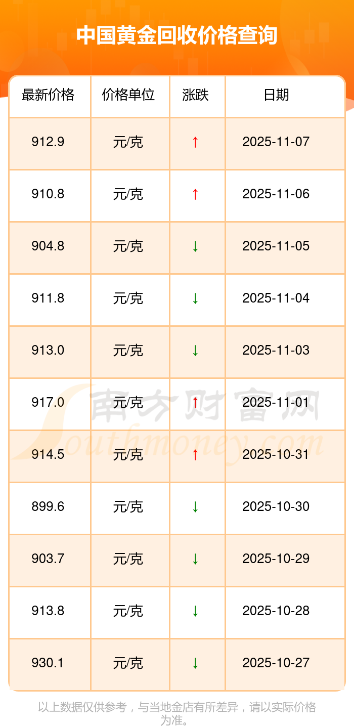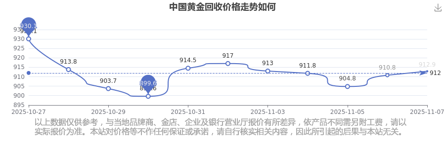 目前中國黃金 回收價(jià)的價(jià)格,今日最新為912.9元/克。
