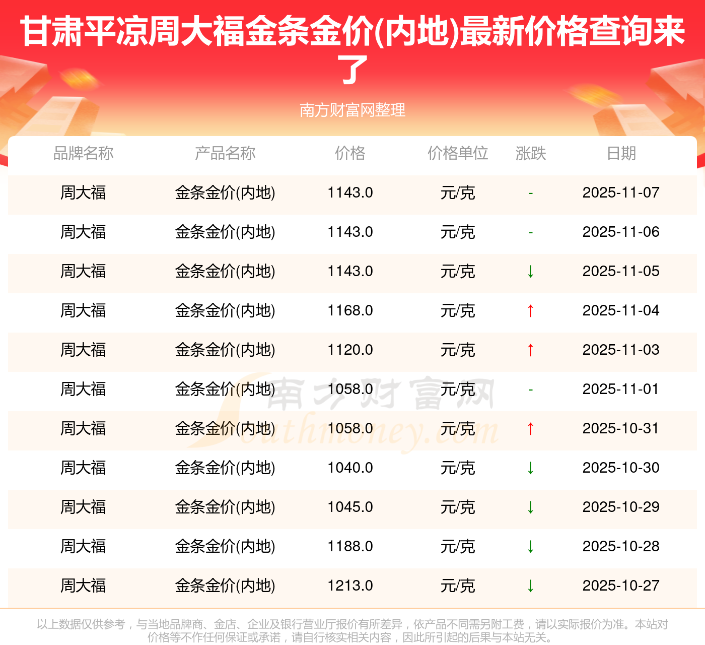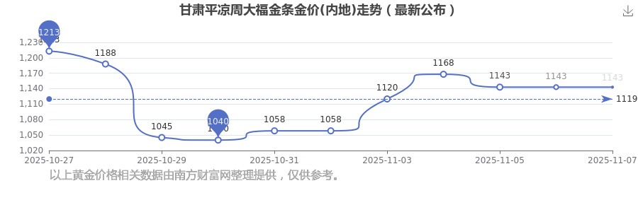 (2025年11月8日)甘肅平?jīng)鲋艽蟾=饤l金價(jià)(內(nèi)地)現(xiàn)在為1143.0元/克。