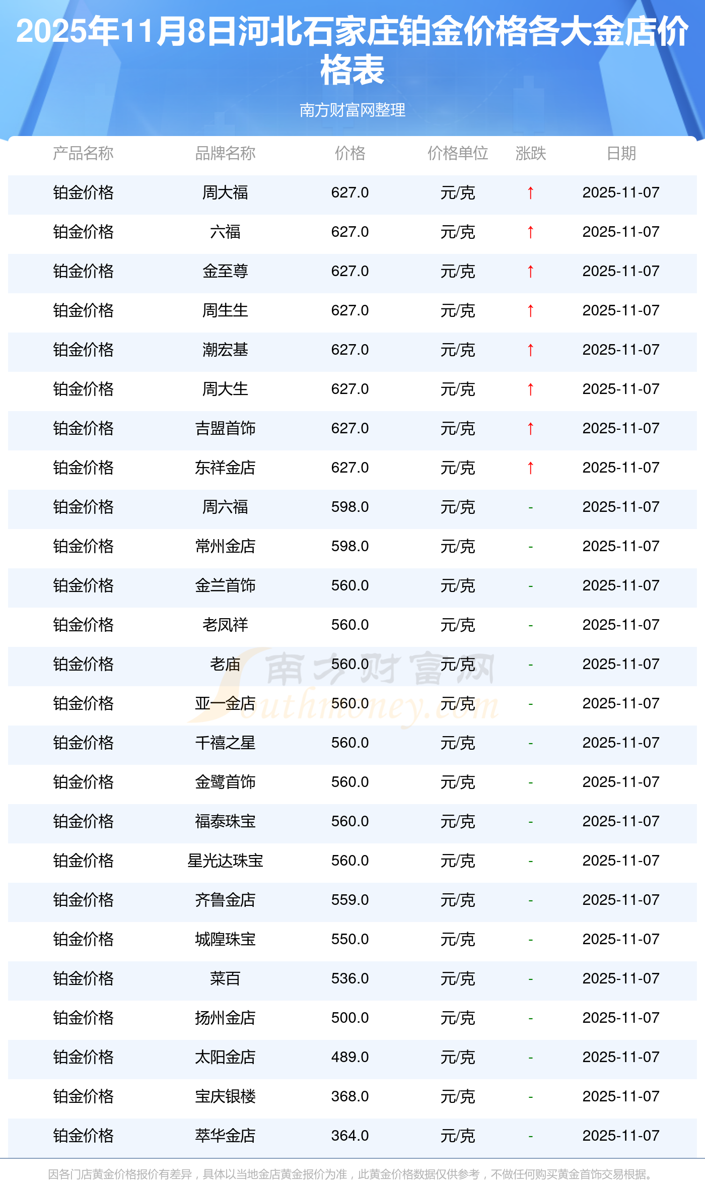 2025年11月8日河北石家莊寶泉錢幣、金蘭首飾、金蘭首飾、謝瑞麟、謝瑞麟、謝瑞麟、謝瑞麟、謝瑞麟、金銀街、金銀街、金銀街等各大金店品牌鉑金價(jià)格最新價(jià)格行情來(lái)了,如下:寶泉錢幣銀條價(jià)格11.4元/克,金蘭首飾黃金價(jià)格1263.0元/克,金蘭首飾鉑金價(jià)格560.0元/克,謝瑞麟金條價(jià)格(內(nèi)地)1202.0元/克,謝瑞麟金飾價(jià)格(內(nèi)地)1268.0元/克,謝瑞麟黃金飾品(香港)44260.0,謝瑞麟鉑金飾品(香港)13080.0,謝瑞麟金條金價(jià)(香港)39960.0,金銀街投資金條1243.0元/克,金銀街工藝金條1258.0元/克,金銀街千足金首飾1248.0元/克。