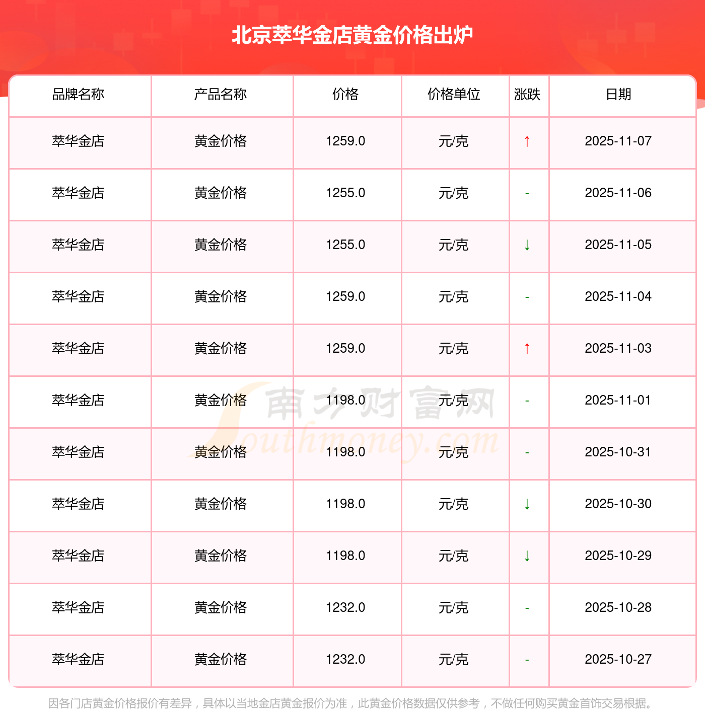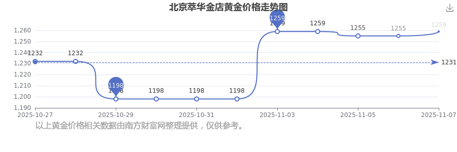 北京萃華金店在 2025年11月8日,黃金價格的售賣價格是 1259.0元/克。