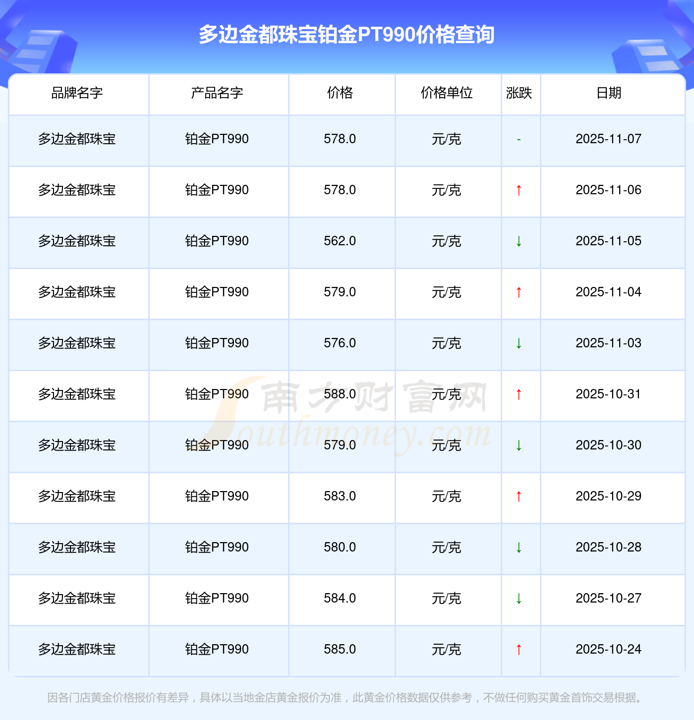 578.0元/克的價(jià)格,是多邊金都珠寶今日 鉑金PT990的最新行情。