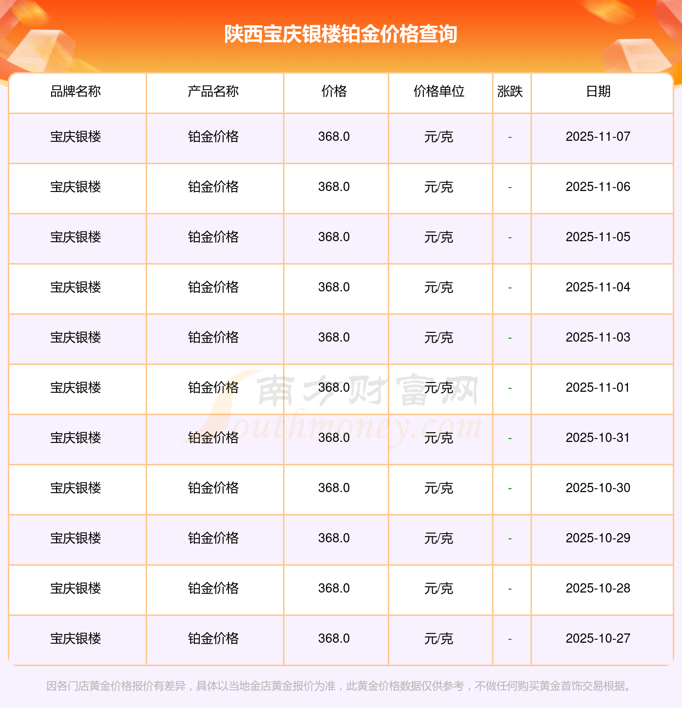 于 2025年11月8日,陜西寶慶銀樓鉑金價格的克價為368.0元/克。