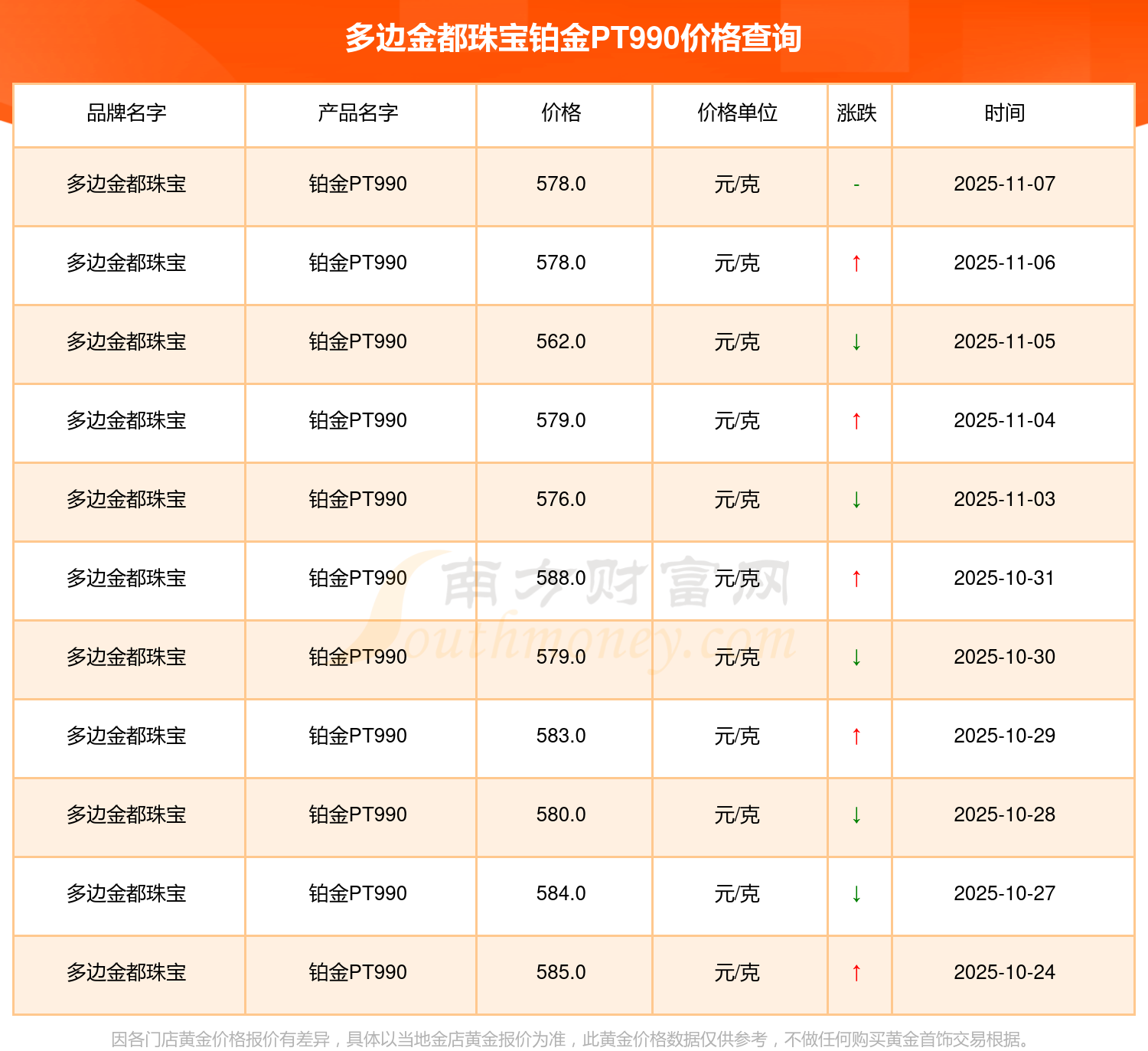 578.0元/克是多邊金都珠寶在今日給出的 鉑金PT990最新價格。
