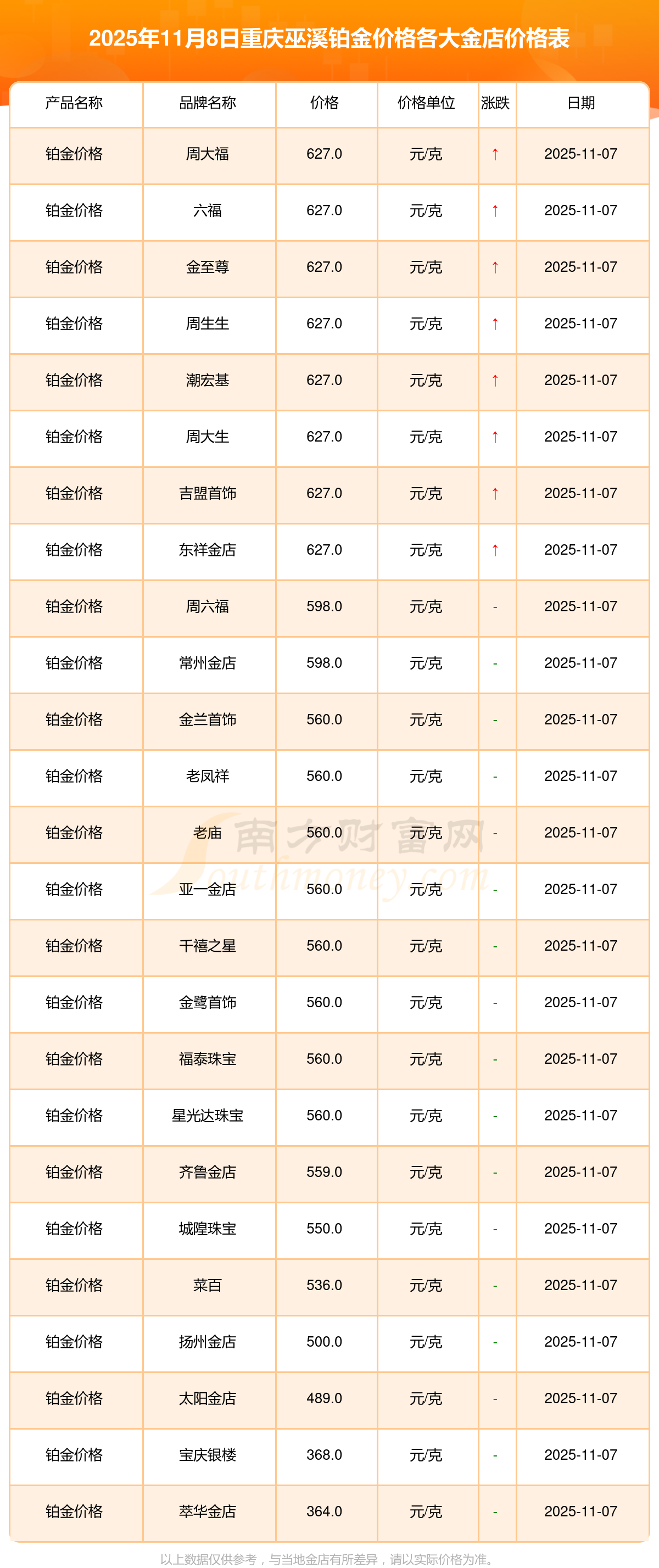 2025年11月8日重慶巫溪各金店鉑金價格是多少錢一克?各金店鉑金價格表公布
