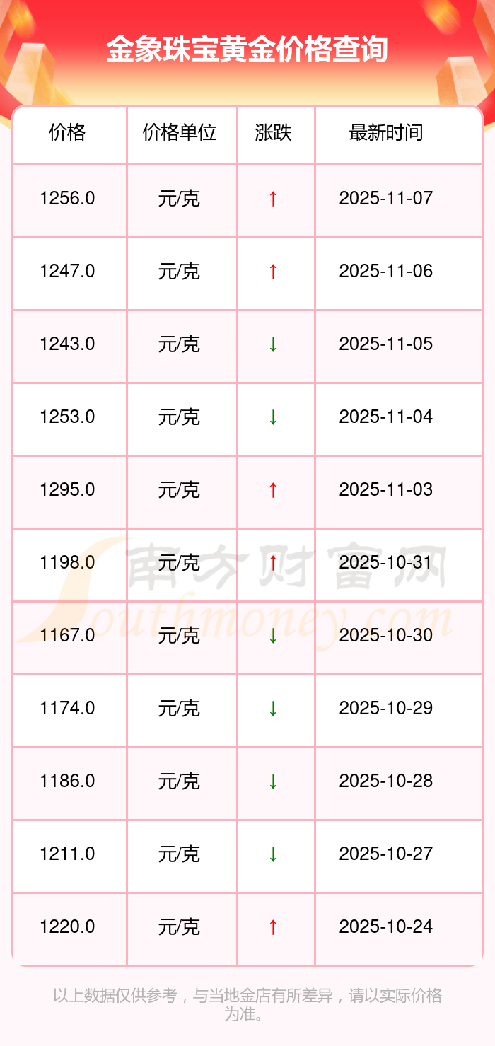 今天黃金價位怎樣呢?現(xiàn)在每克黃金賣多少錢?平常來說一克黃金的價格大概是多少?今日(2025年11月8日)金象珠寶黃金價格是1256.0元/克。