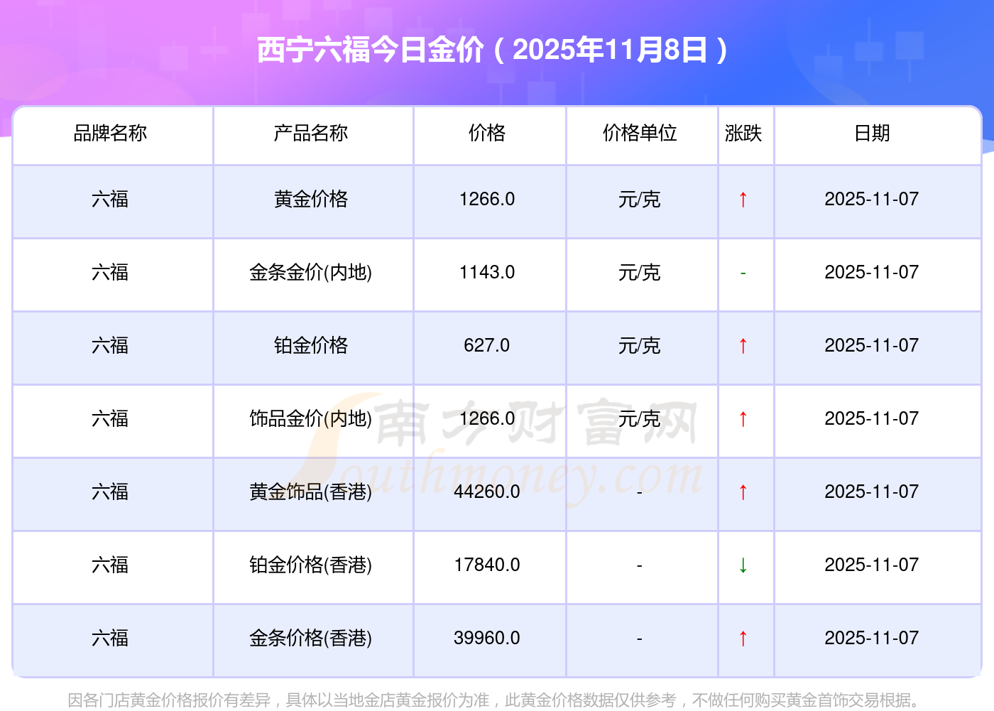 想查詢今日黃金價格,當下黃金一克具體售價幾何?2025年11月8日西寧六福最新價格:銀條價格11.4元/克,黃金價格1263.0元/克,鉑金價格560.0元/克,金條價格(內地)1202.0元/克,金飾價格(內地)1268.0元/克,黃金飾品(香港)44260.0,鉑金飾品(香港)13080.0,金條金價(香港)39960.0,投資金條1243.0元/克,工藝金條1258.0元/克,千足金首飾1248.0元/克。