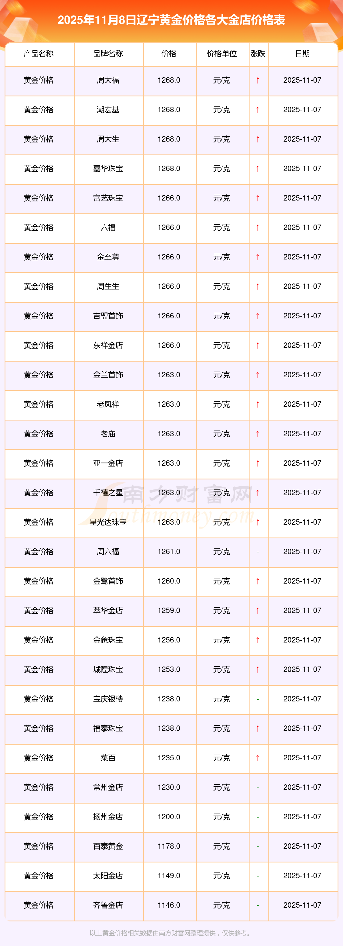 2025年11月8日,遼寧寶泉錢幣、金蘭首飾、金蘭首飾、謝瑞麟、謝瑞麟、謝瑞麟、謝瑞麟、謝瑞麟、金銀街、金銀街、金銀街等各大金店品牌黃金價(jià)格今日價(jià)格如下:寶泉錢幣11.4元/克、金蘭首飾1263.0元/克、金蘭首飾560.0元/克、謝瑞麟1202.0元/克、謝瑞麟1268.0元/克、謝瑞麟44260.0、謝瑞麟13080.0、謝瑞麟39960.0、金銀街1243.0元/克、金銀街1258.0元/克、金銀街1248.0元/克。