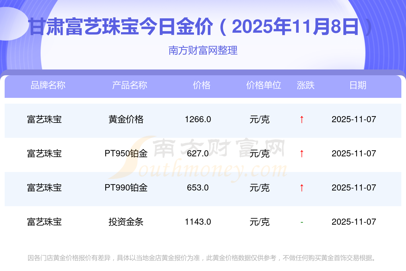 今日黃金售價(jià)多少?現(xiàn)在黃金一克值多少錢呢?2025年11月8日甘肅富藝珠寶每克黃金的市場(chǎng)價(jià)格是多少:銀條價(jià)格11.4元/克,黃金價(jià)格1263.0元/克,鉑金價(jià)格560.0元/克,金條價(jià)格(內(nèi)地)1202.0元/克,金飾價(jià)格(內(nèi)地)1268.0元/克,黃金飾品(香港)44260.0,鉑金飾品(香港)13080.0,金條金價(jià)(香港)39960.0,投資金條1243.0元/克,工藝金條1258.0元/克,千足金首飾1248.0元/克。