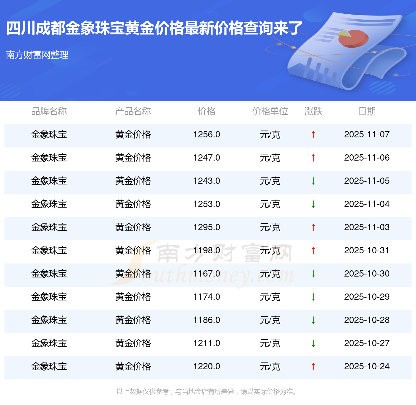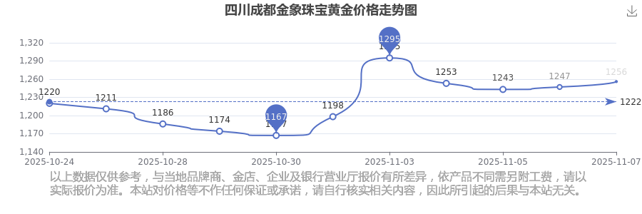 四川成都金象珠寶黃金價格在 2025年11月8日,其市場價格為 1256.0元/克。