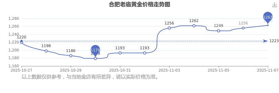 今日(2025年11月8日),合肥老廟黃金價(jià)格的定價(jià)為 1263.0元/克。