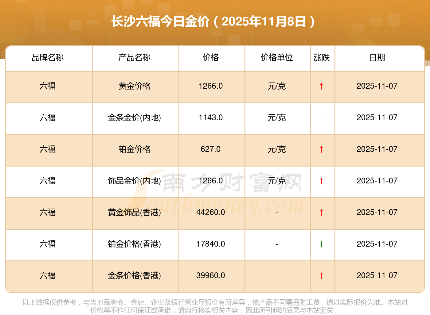 2025年11月8日長沙六福黃金按克計價,現(xiàn)在多少錢一克?銀條價格11.4元/克,黃金價格1263.0元/克,鉑金價格560.0元/克,金條價格(內(nèi)地)1202.0元/克,金飾價格(內(nèi)地)1268.0元/克,黃金飾品(香港)44260.0,鉑金飾品(香港)13080.0,金條金價(香港)39960.0,投資金條1243.0元/克,工藝金條1258.0元/克,千足金首飾1248.0元/克。