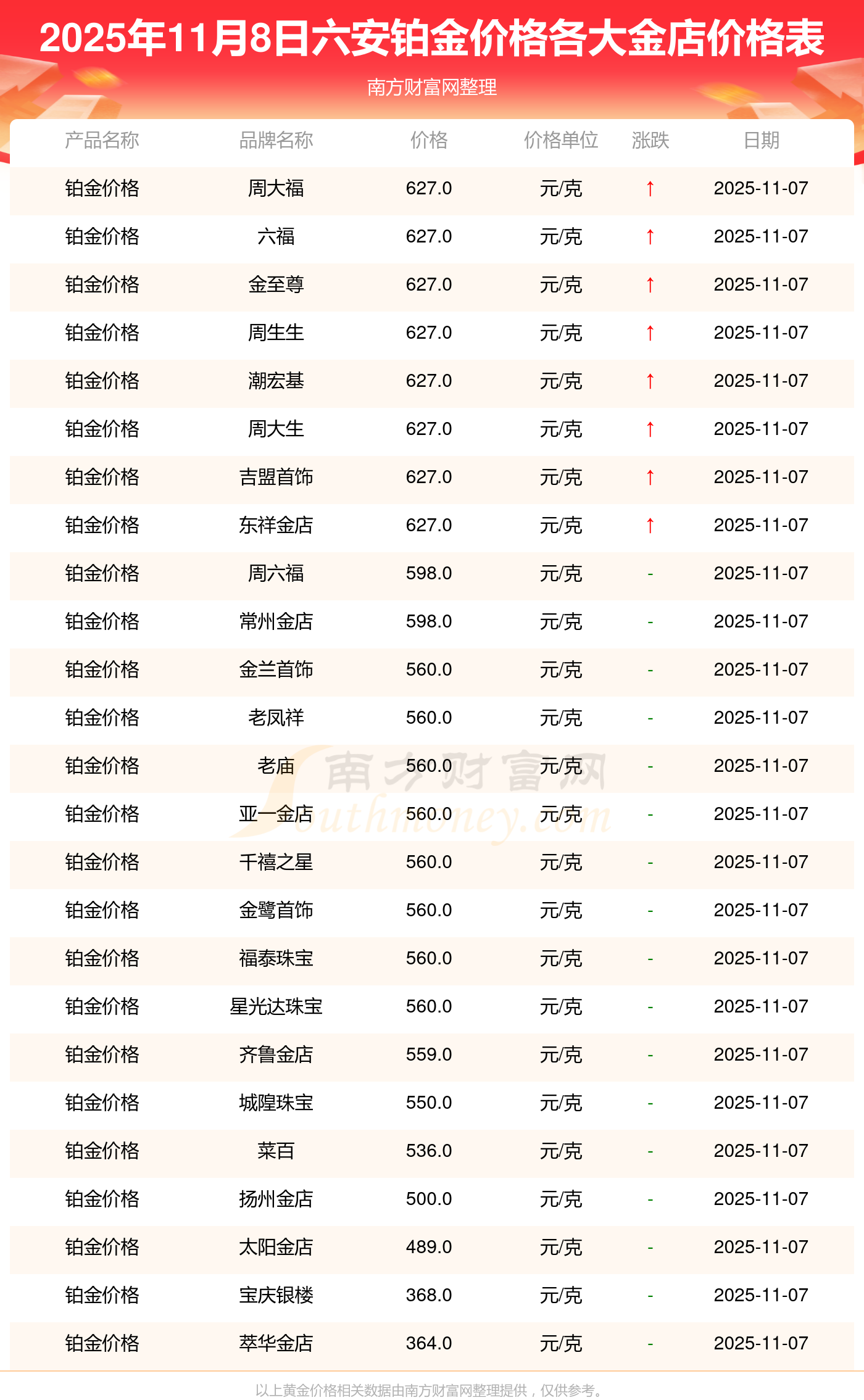 2025年11月8日六安各大金店鉑金價(jià)格最新價(jià)格查詢來(lái)了:寶泉錢(qián)幣11.4元/克,金蘭首飾1263.0元/克,金蘭首飾560.0元/克,謝瑞麟1202.0元/克,謝瑞麟1268.0元/克,謝瑞麟44260.0,謝瑞麟13080.0,謝瑞麟39960.0,金銀街1243.0元/克,金銀街1258.0元/克,金銀街1248.0元/克。