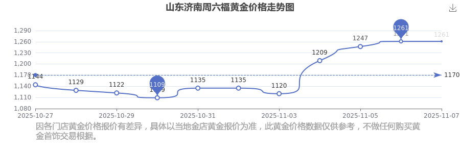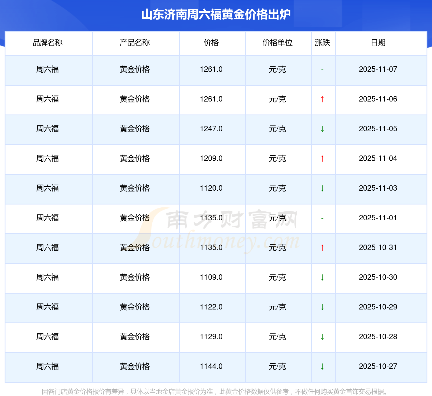 今日(2025年11月8日),山東濟(jì)南周六福黃金價(jià)格:1261.0元/克。