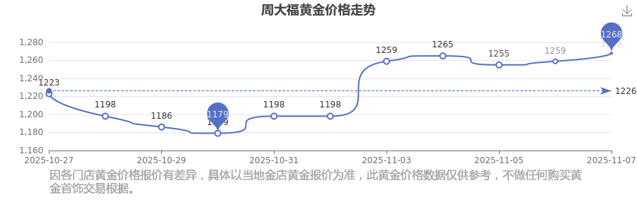 想知道今日黃金價格,目前黃金一克的價錢是多少呀?黃金價格一般是多少錢一克?今日周大福黃金價格最新查詢:1268.0元/克。