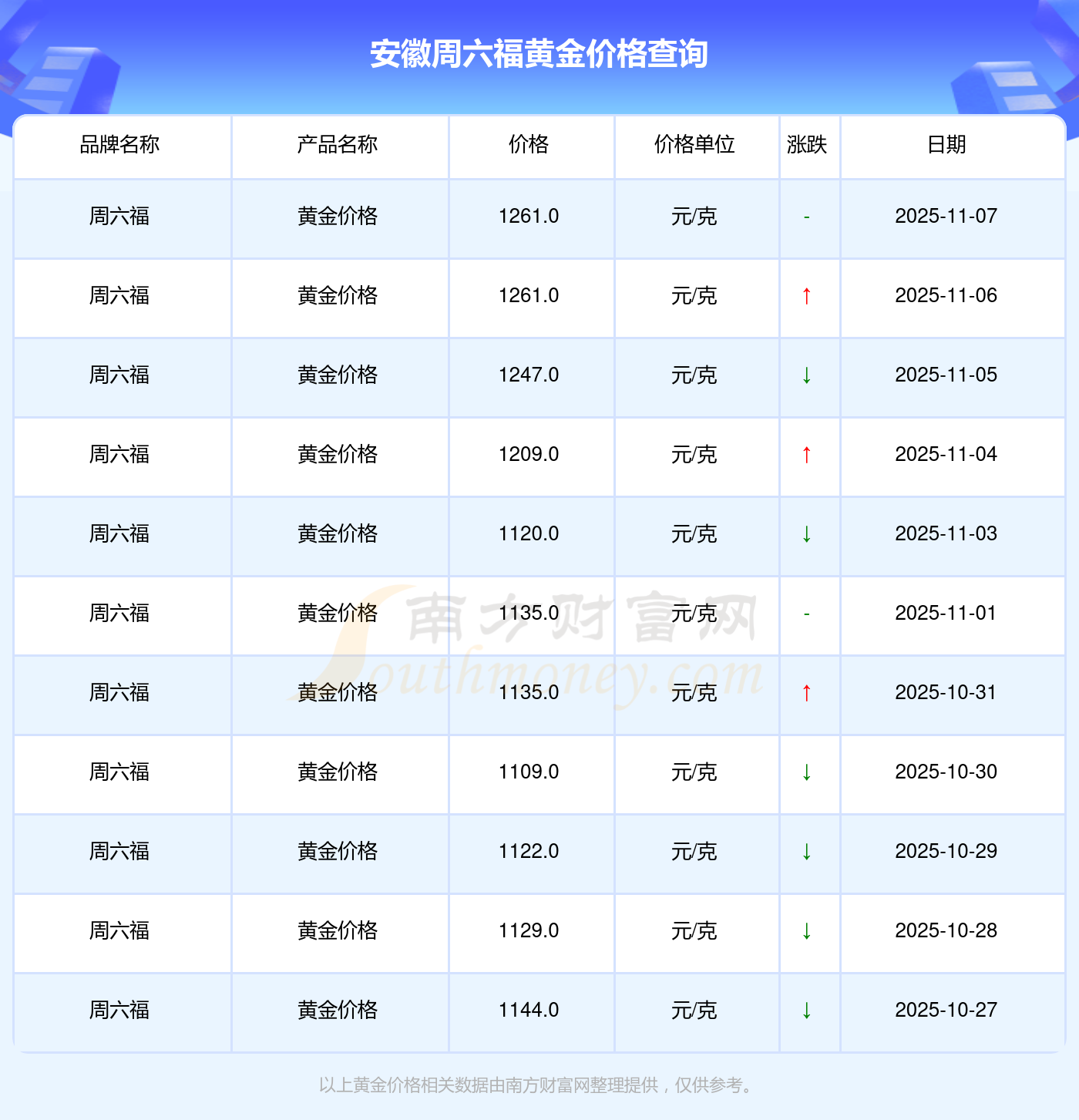 今日安徽周六福黃金價格的價格為1261.0元/克。