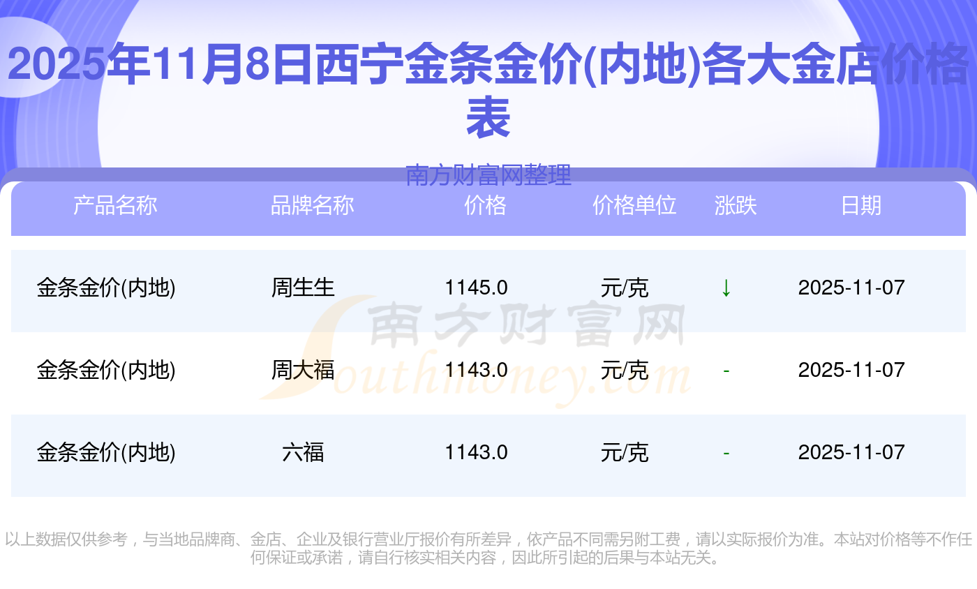 今天是2025年11月8日,西寧寶泉錢幣、金蘭首飾、金蘭首飾、謝瑞麟、謝瑞麟、謝瑞麟、謝瑞麟、謝瑞麟、金銀街、金銀街、金銀街等各大金店品牌金條金價(內地)最新價格如下:寶泉錢幣11.4元/克、金蘭首飾1263.0元/克、金蘭首飾560.0元/克、謝瑞麟1202.0元/克、謝瑞麟1268.0元/克、謝瑞麟44260.0、謝瑞麟13080.0、謝瑞麟39960.0、金銀街1243.0元/克、金銀街1258.0元/克、金銀街1248.0元/克。