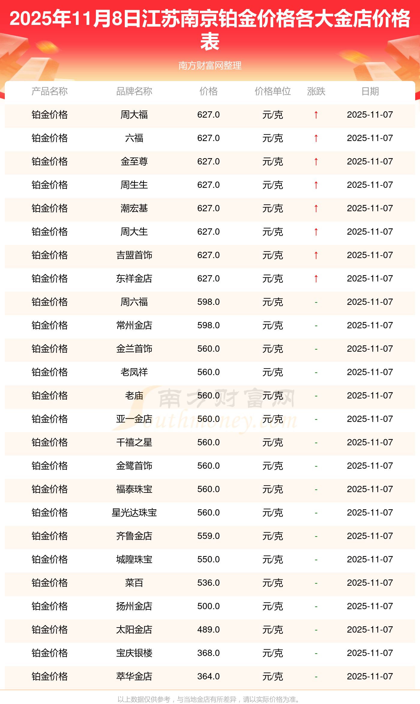2025年11月8日江蘇南京寶泉錢幣、金蘭首飾、金蘭首飾、謝瑞麟、謝瑞麟、謝瑞麟、謝瑞麟、謝瑞麟、金銀街、金銀街、金銀街等各大金店品牌鉑金價(jià)格最新價(jià)格如下:寶泉錢幣銀條價(jià)格11.4元/克,金蘭首飾黃金價(jià)格1263.0元/克,金蘭首飾鉑金價(jià)格560.0元/克,謝瑞麟金條價(jià)格(內(nèi)地)1202.0元/克,謝瑞麟金飾價(jià)格(內(nèi)地)1268.0元/克,謝瑞麟黃金飾品(香港)44260.0,謝瑞麟鉑金飾品(香港)13080.0,謝瑞麟金條金價(jià)(香港)39960.0,金銀街投資金條1243.0元/克,金銀街工藝金條1258.0元/克,金銀街千足金首飾1248.0元/克。