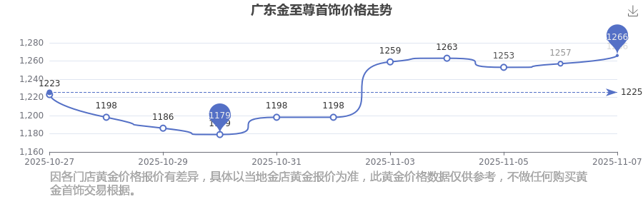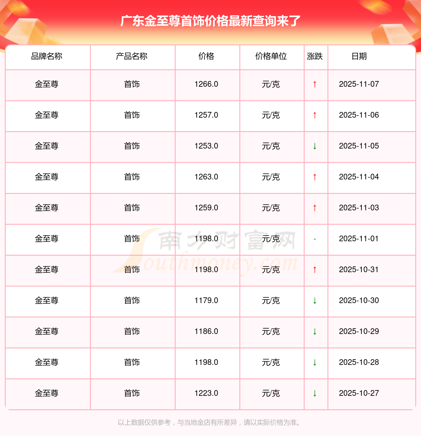 2025年11月8日廣東金至尊首飾價格為1266.0元/克。