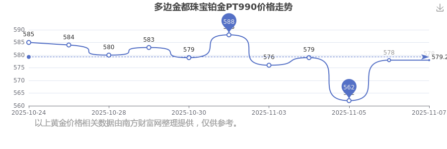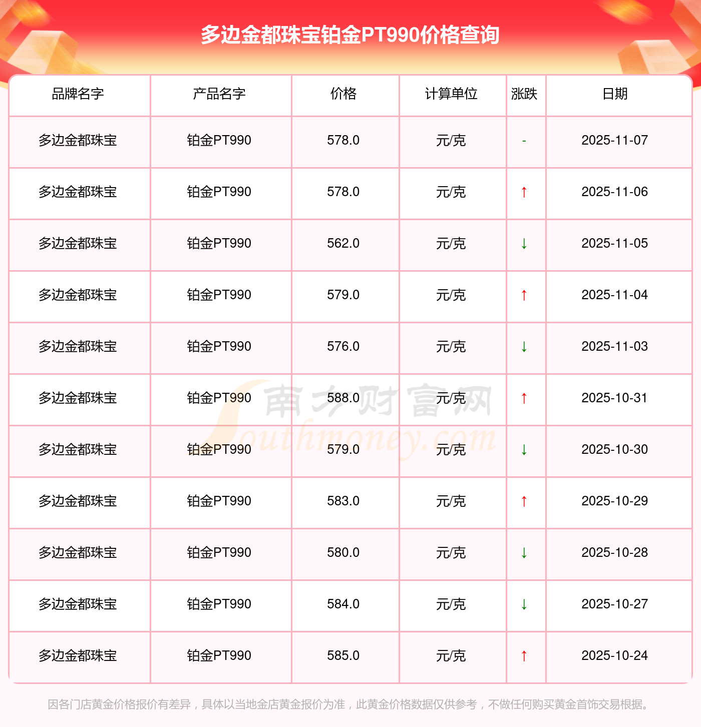 今日(2025年11月8日),多邊金都珠寶鉑金PT990最新價格為578.0元/克。
