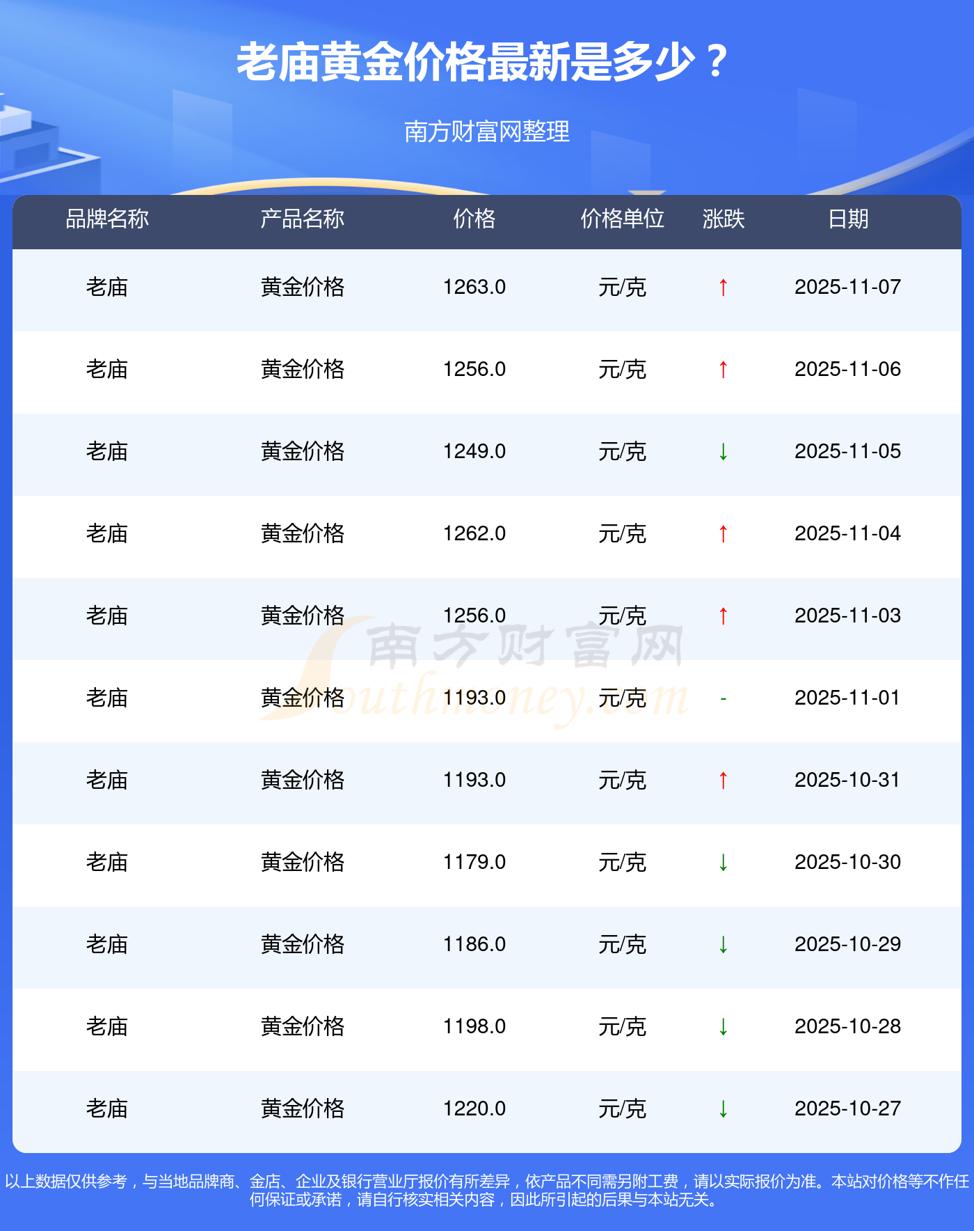 2025年11月8日老廟黃金價(jià)格是1263.0元/克。