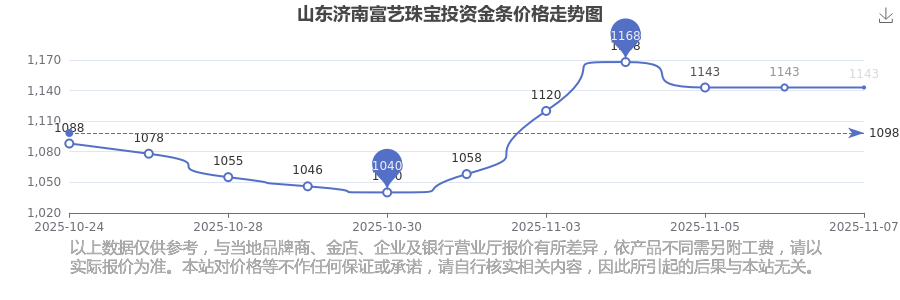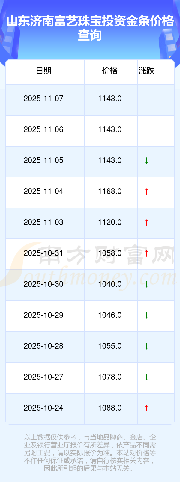 2025年11月8日山東濟南富藝珠寶投資金條價格:1143.0元/克。