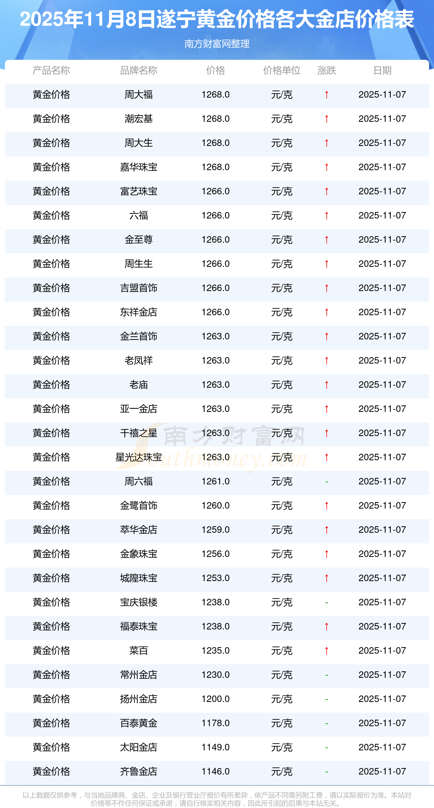 2025年11月8日遂寧寶泉錢幣、金蘭首飾、金蘭首飾、謝瑞麟、謝瑞麟、謝瑞麟、謝瑞麟、謝瑞麟、金銀街、金銀街、金銀街等各大金店品牌黃金價格最新價格如下:寶泉錢幣銀條價格11.4元/克,金蘭首飾黃金價格1263.0元/克,金蘭首飾鉑金價格560.0元/克,謝瑞麟金條價格(內(nèi)地)1202.0元/克,謝瑞麟金飾價格(內(nèi)地)1268.0元/克,謝瑞麟黃金飾品(香港)44260.0,謝瑞麟鉑金飾品(香港)13080.0,謝瑞麟金條金價(香港)39960.0,金銀街投資金條1243.0元/克,金銀街工藝金條1258.0元/克,金銀街千足金首飾1248.0元/克。