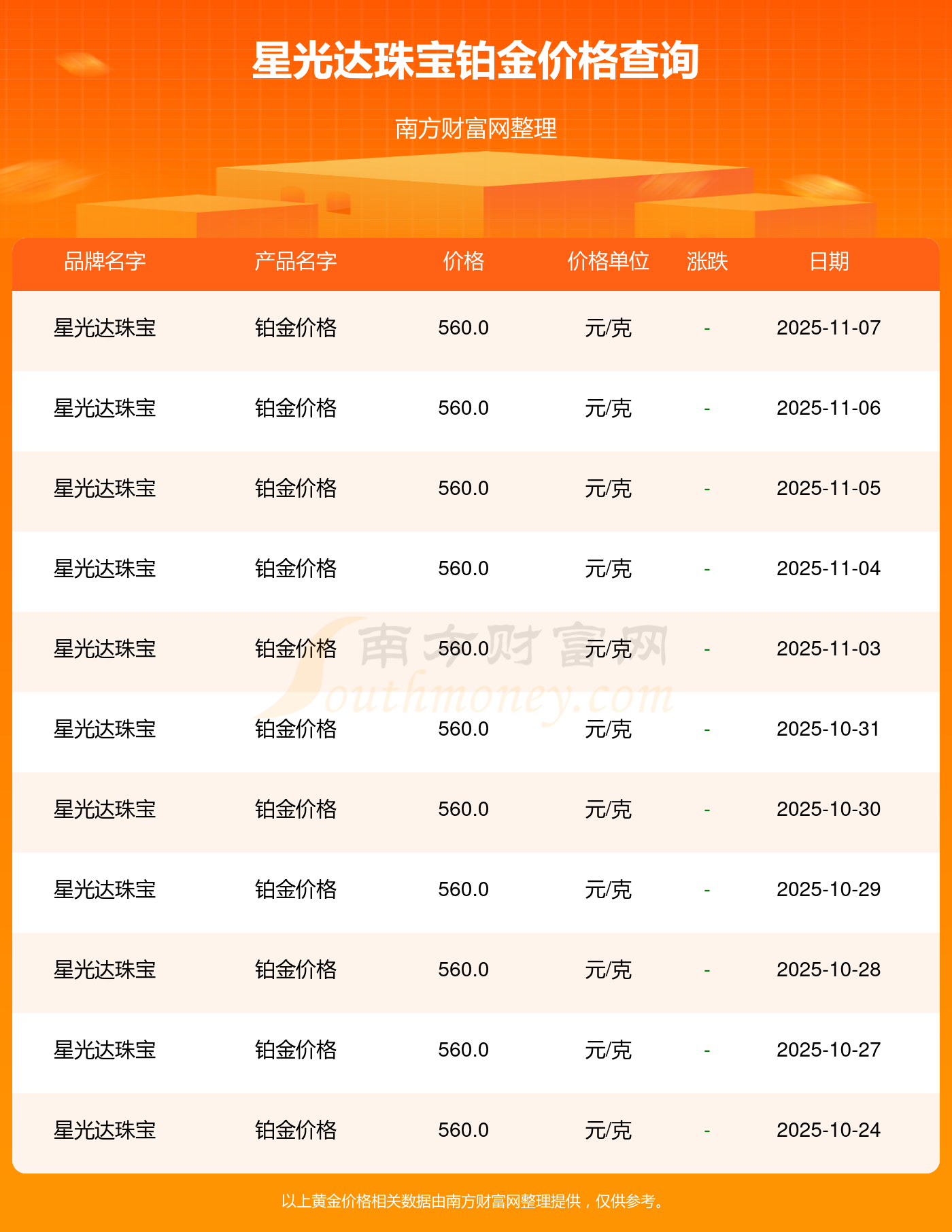 今日(2025年11月8日),星光達(dá)珠寶鉑金價(jià)格:560.0元/克。