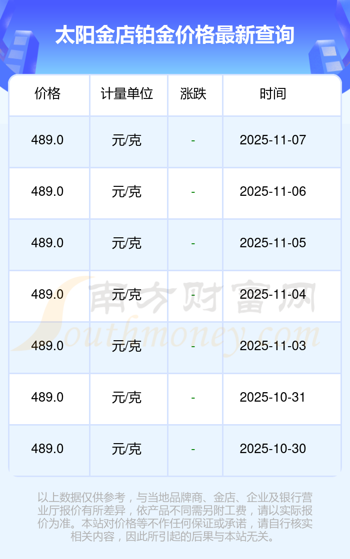 太陽(yáng)金店今日 鉑金價(jià)格的最新市場(chǎng)行情價(jià)為489.0元/克。