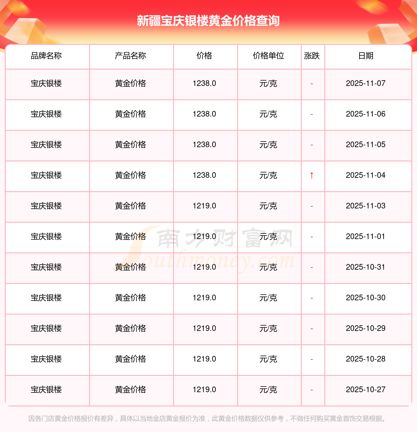 今日新疆寶慶銀樓黃金價(jià)格公布黃金價(jià)格今天多少一克2025年11月8日,新疆寶慶銀樓黃金價(jià)格每克的售賣價(jià)位為1238.0元/克。