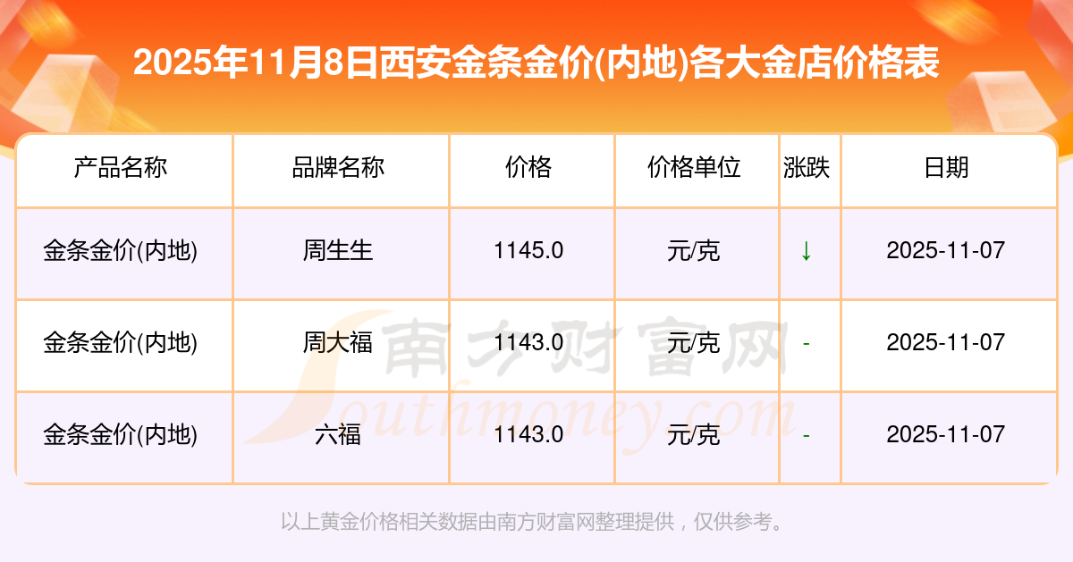 西安各大金店金條金價(內(nèi)地)表來了-2025年11月8日西安各大金店金條金價(內(nèi)地)多少錢一克?