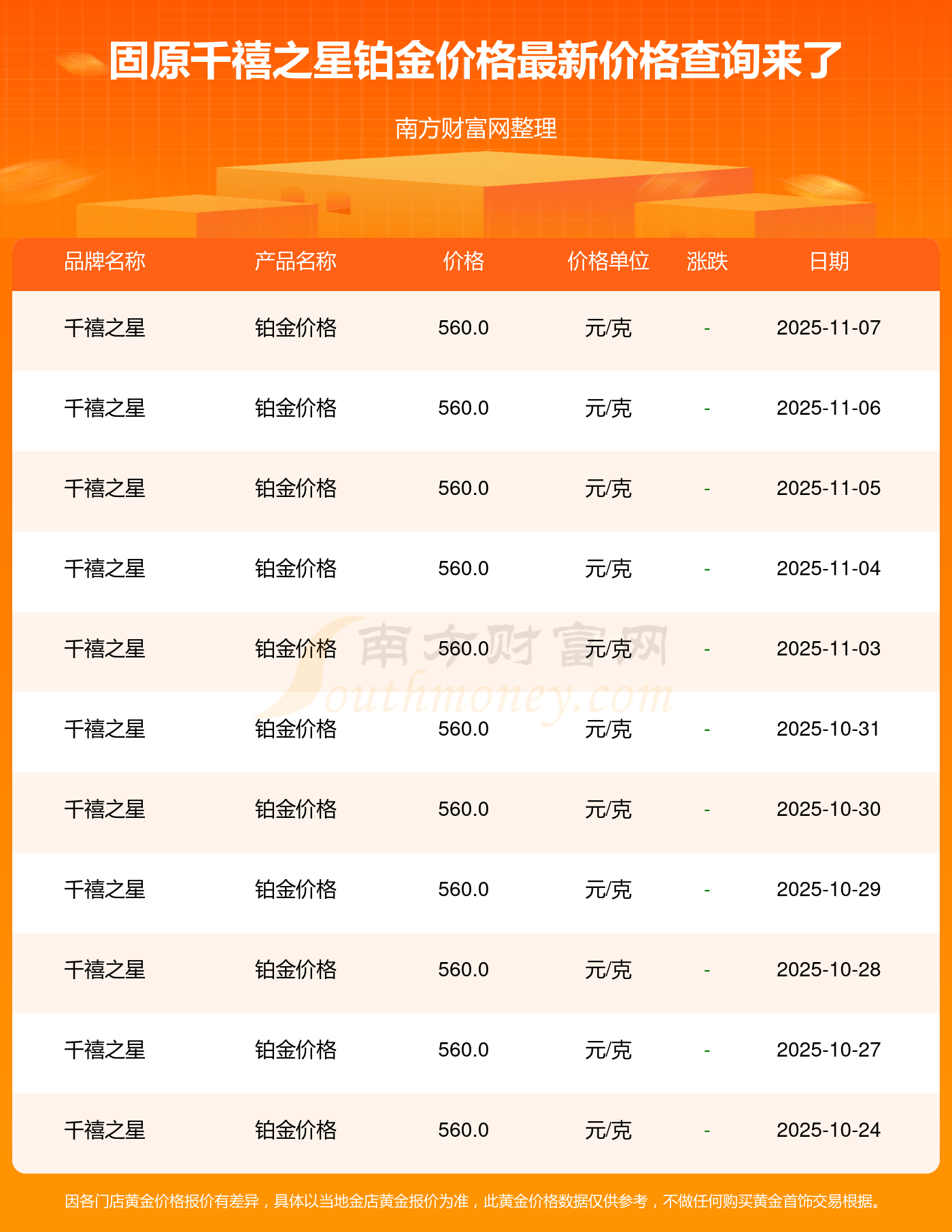 2025年11月8日,今日固原千禧之星鉑金價(jià)格:560.0元/克。